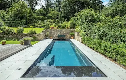 European pool design that features the unique high-water line look. The auto cover area is placed at the front of the pool rather than the traditional deep end. This is a showcase pool design that can also be complimented with inground pool lights to accent its classic rectangle shape.